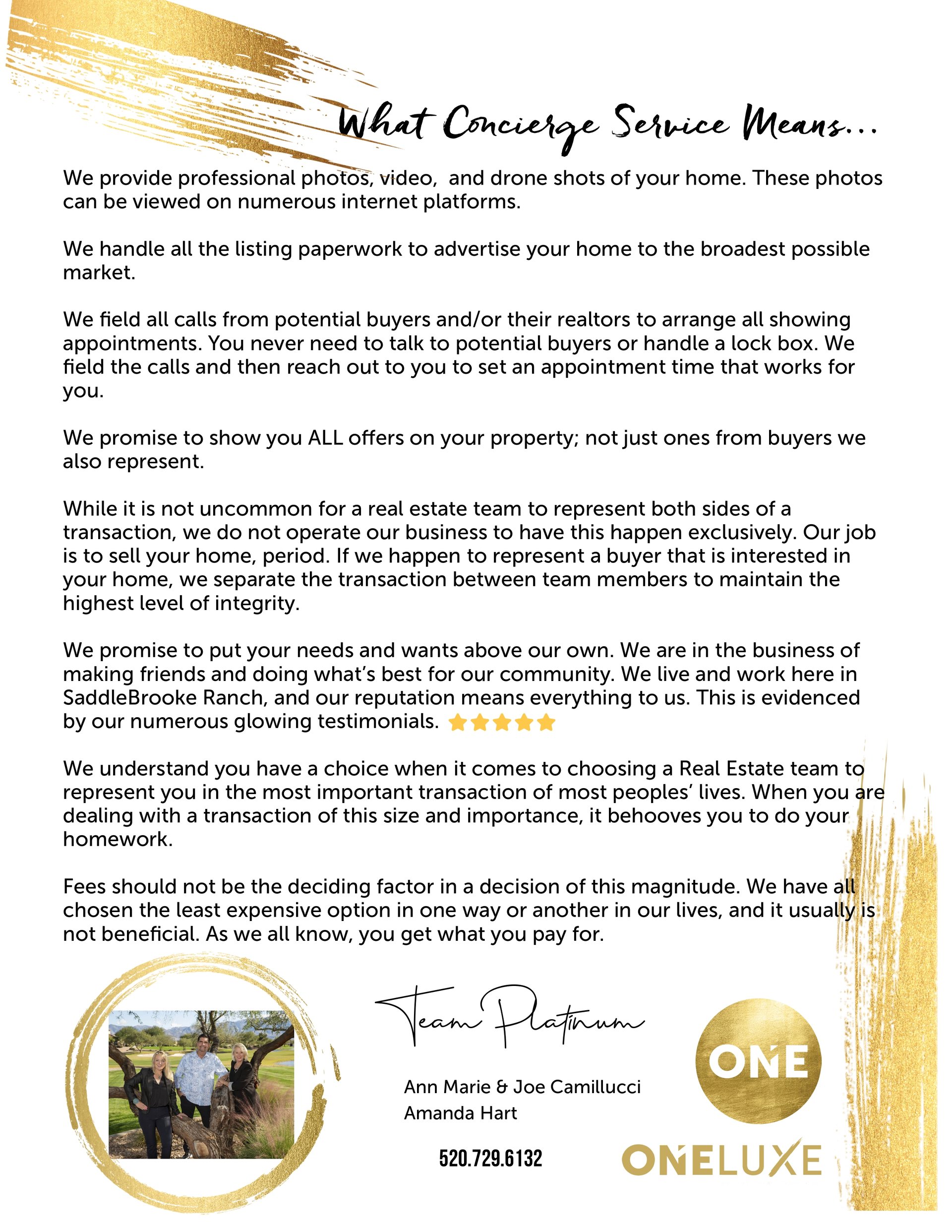 Our concierge service provides a seamless, full-service home selling experience designed to maximize exposure while protecting your time and peace of mind. From professional photography, video, and drone marketing to handling all listing paperwork, buyer inquiries, and showing appointments, we manage every detail with precision and care. We present every offer transparently, prioritize your best interests at every step, and uphold the highest standards of integrity—ensuring your home is sold with professionalism, strategy, and a commitment to delivering an exceptional, stress-free experience.